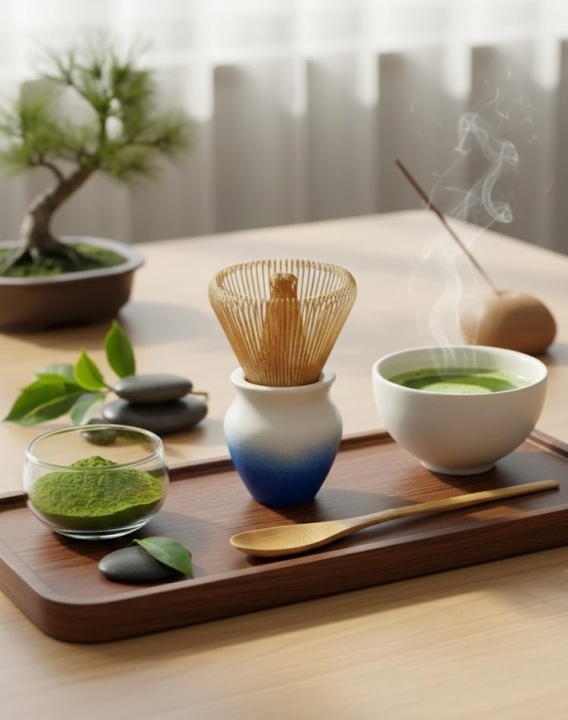 Chasen (Bambusowa miotełka): Wykonana z jednego kawałka jasnego bambusa, posiada gęste, precyzyjnie nacięte włosie (100 tines), które pozwala na idealne spienienie herbaty.